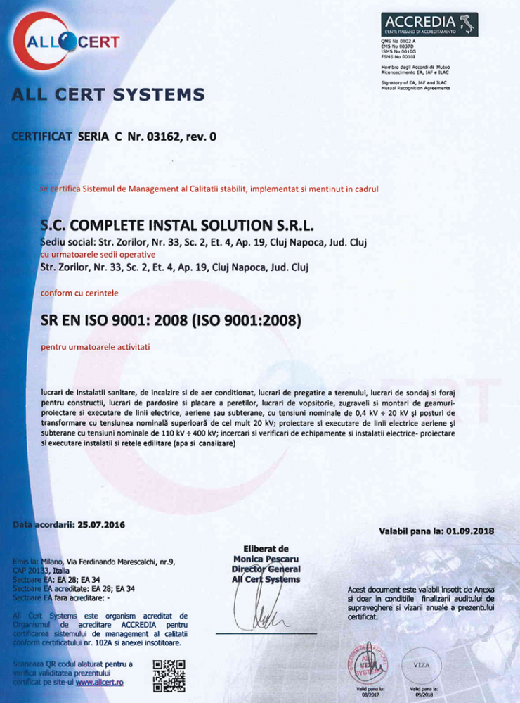 Certificat pentru: lucrări de instalații sanitare, de încălzire și aer condiționat, lucrări de pregătire a terenului, lucrări de sondaj și foraj pentru construcții, lucrări de pardosire și placare a pereților, lucrări de vopsitorie, zugrăveli și montări de geamuri, proiectare și executare de linii electrice aeriene sau subterane, cu tensiuni nominale de 0,4 kV ÷ 20 kV […]